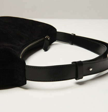 스웨이드 재질의 라운드모양 가방이에요. 가벼운 가죽소재로 실용성이 매우 뛰어나고, 이너포켓도 있어서 수납력이 좋습니다. 그리고 스트랩에 6개의 홀이 있어서 길이조절도 가능해서 크로스로도 맬 수 있어요.